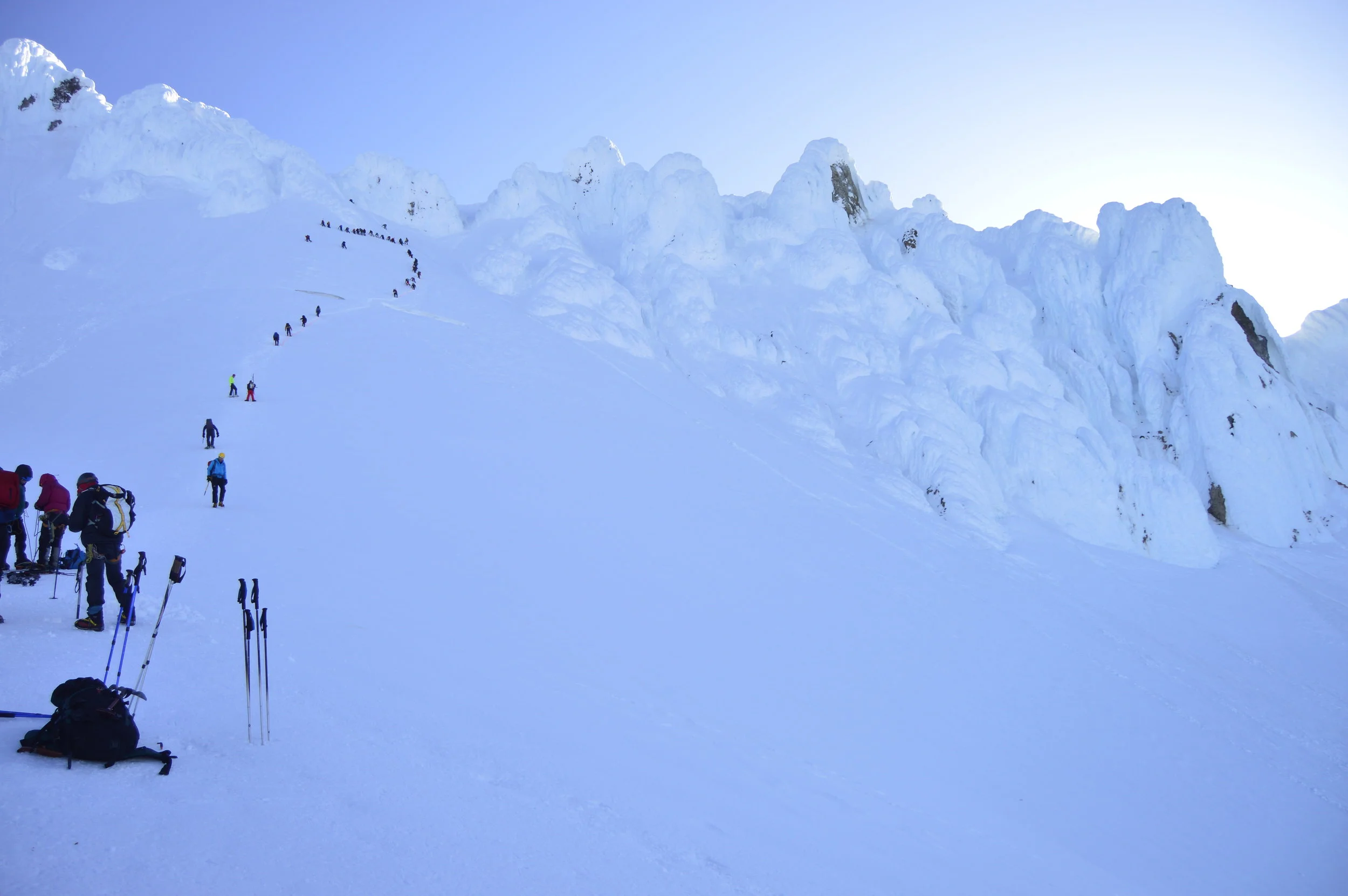 We made it the top of Devil's Kitchen. We took a break to add layers and go over our plan for summiting the final more technical section through the Pearly Gates—a steep icy stretch leading directly to the summit.