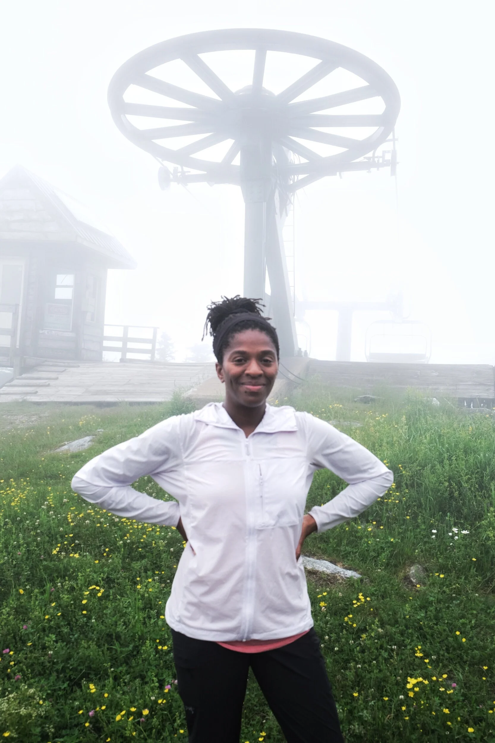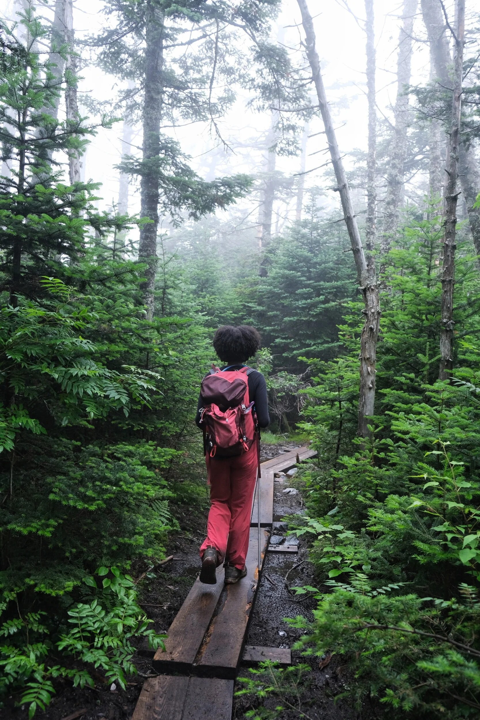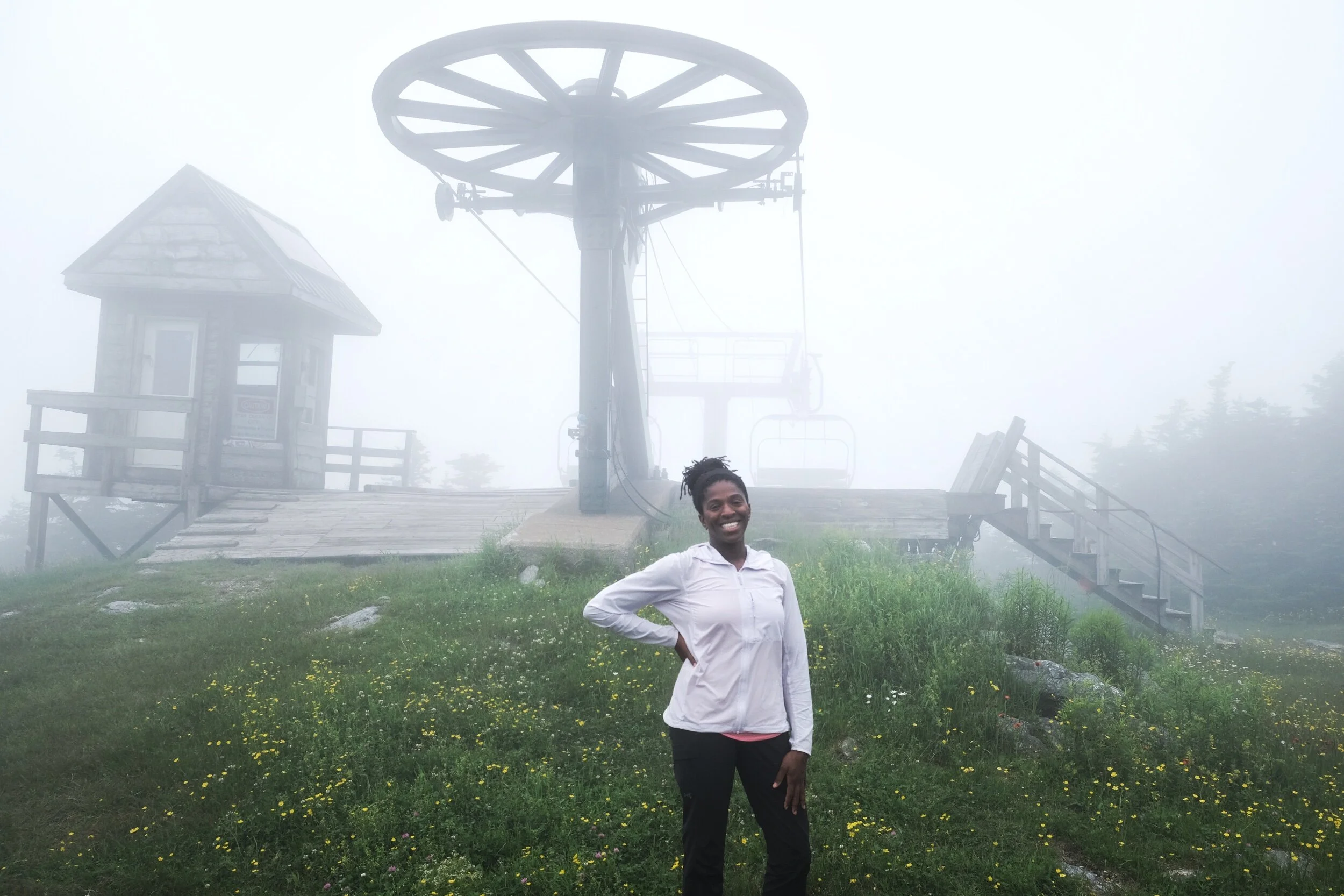 I recently returned to the Long Trail for an eight mile hike to Sugarbush Ski Resort at Mount Ellen (4083 ft.) The mountain has 11 wooded areas and over 30 different trails to explore. It’s located on N’dakina (Abenaki) and Wabanki land. During a recent hike, fog obscured the view from the summit. Photo credit: Christena Cleveland.