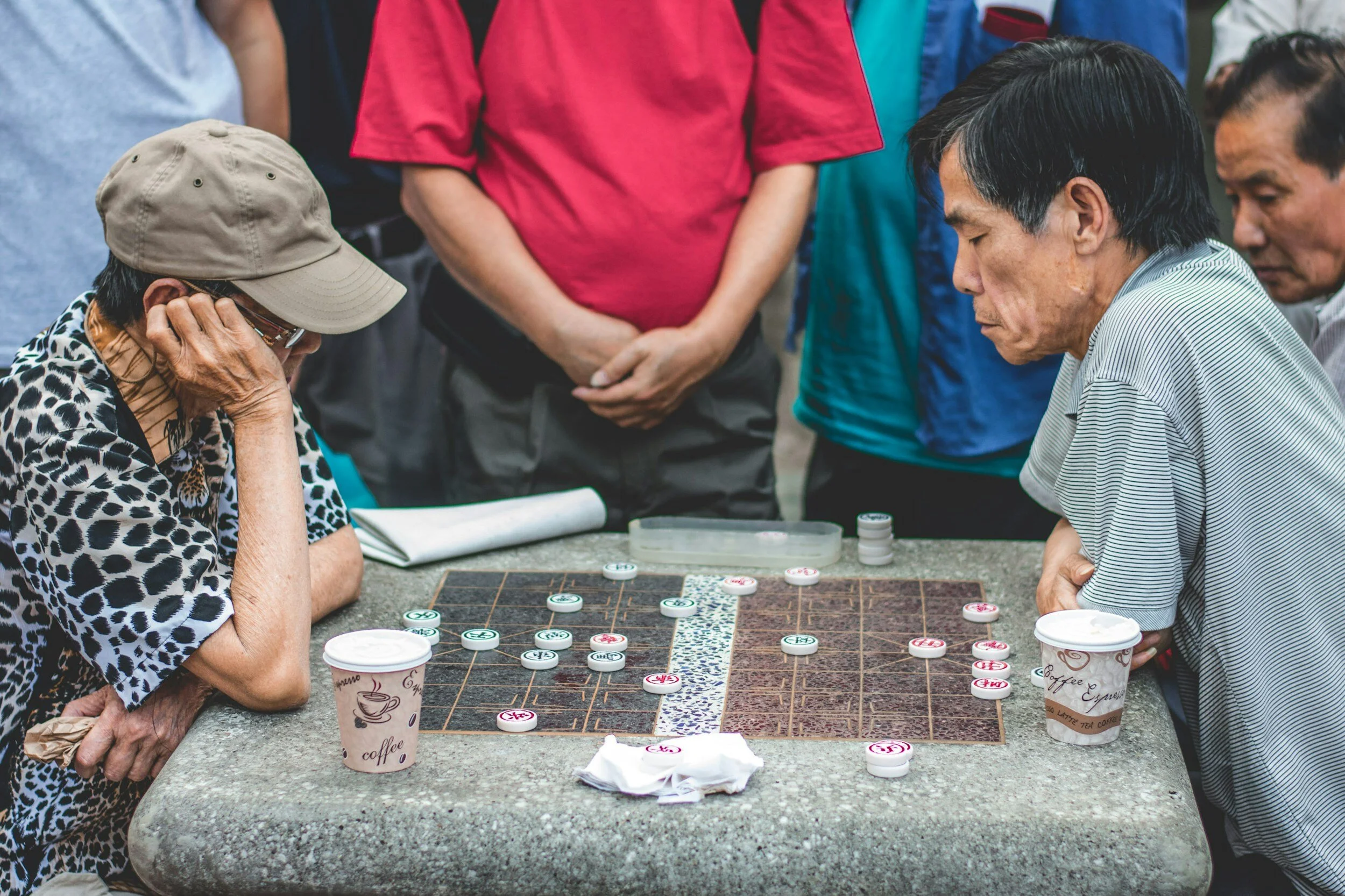 Two older adults enjoy a game of xiang qi. Photo by Arthur Osipyan on Unsplash