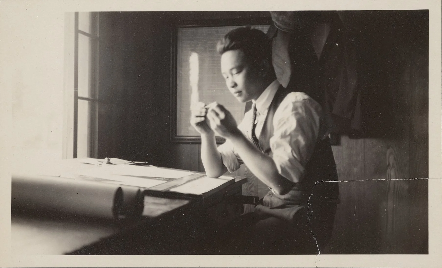 Peter Soo Hoo sits at a drafting table. Source: Huntington Digital Library