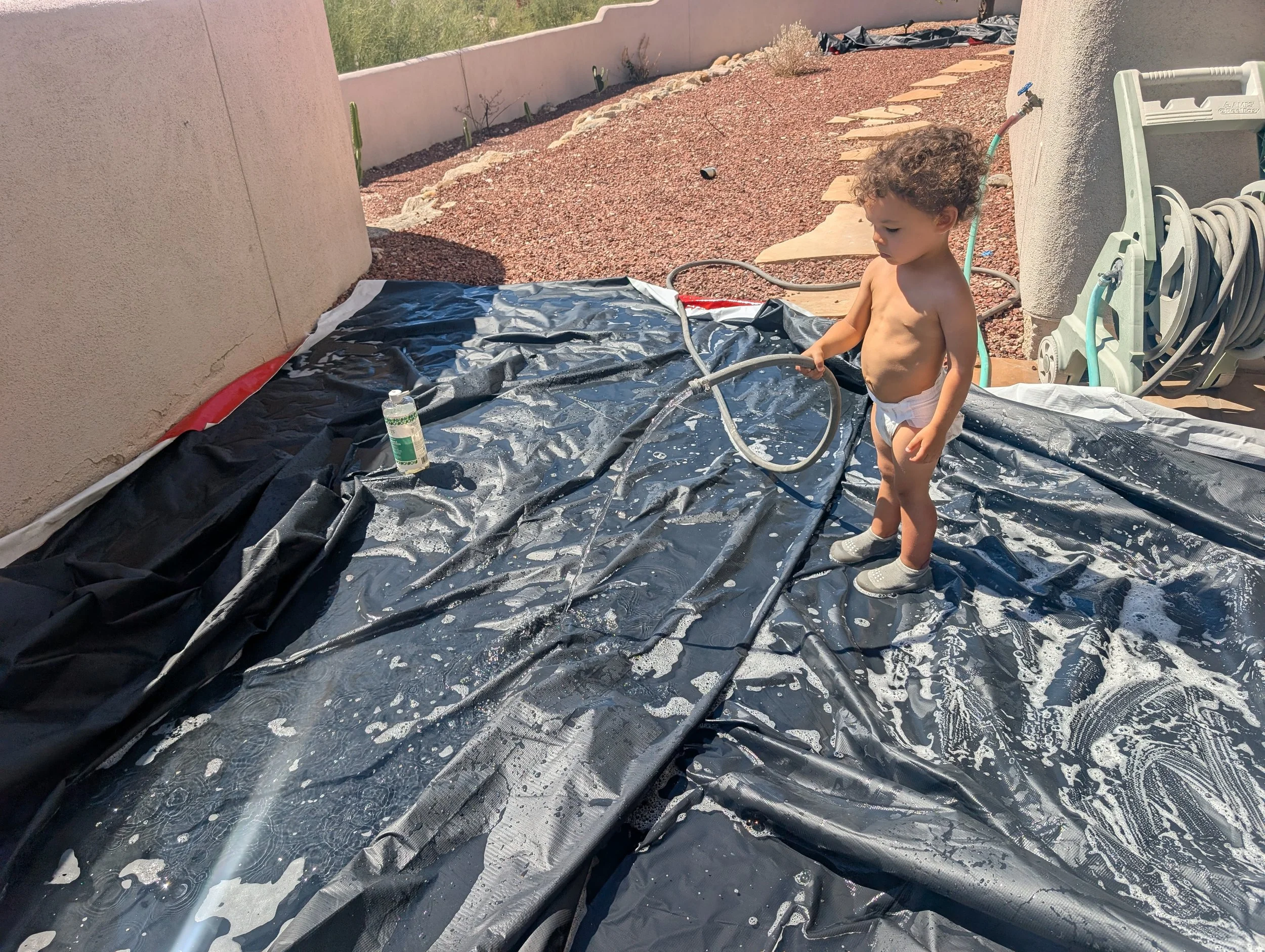 My lifestyle of multiple cats, a dog, and a toddler means that I needed a waterproof (and urine proof) cover. My landing area is 16 feet by 14 ft by 4 inches, so quite large for a home wall. Since I was trying to copy Organic crashpads, I looked at the material they used- 1200d Recycled Cordura and 1050d Ballistic Nylon. Unfortunately, that would cost me thousands and I’d need a special sewing machine in order to sew the very tough materials. I’d also have to learn how to add zippers. So I decided to try a vinyl material that is often used on boats. I went to fabric stores for quotes, since I would still need a special sewing machine and zippers. The quotes I received ranged from 2000 to 3000 dollars. Still too expensive. I started reading about landing pads for all sorts of different sports including jiu jitsu and gymnastics. I found a man in California who makes athletic pads for Hollywood movies out of a waterproof vinyl. His quote was 750 for a top layer, but I would have to figure out how to attach the vinyl to my foam. He seemed like a good bet, until I discovered BILLBOARDS! Billboards are tough, durable, and waterproof enough to survivor monsoons, so they may have a chance against my household. There is a company that sells used billboards and I was able to buy 50 feet for 110 dollars. The only downside to the billboard is that it arrived with bird poop on it. Hans Sven and I had to wash it off, which was also an endeavor because a billboard is quite heavy and unwieldy.